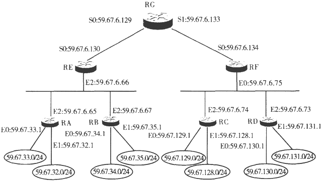 [问答题]请根据下图所示网络结构回答下列问题。图 网络结构示意图(1)填写路由器RG的路由表项【1】~【4】。 (2)请写出路由器RG和路由器RE的S0口的I