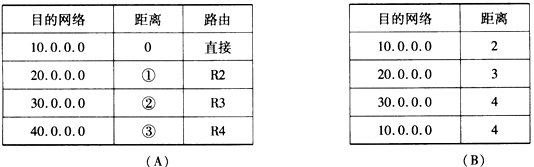 R1、R2是一个自治系统中采用RIP路由协议的两个相邻路由器,R1的路由表如下图(A)所示,当R1收到R2发送的如下图(B)的[V,D]报文后,R1更新的4个路由表项中距离值从上到下依次为0、4、4、3。