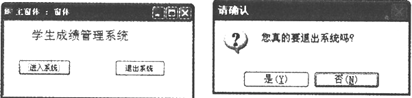 某学生成绩管理系统的“主窗体”如下左图所示,单击“退出系统”按钮会弹出下右图“请确认”提示框;如果继续单击“是”按钮,才会关闭主窗体退出系统;如果单击“否”按钮,则会返回“主窗体”继续运行系统