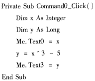 以下程序的功能是求“x^3-5”表达式的值,其中x的值由文本框Text0输入,运算的结果由文本框Text3输出。