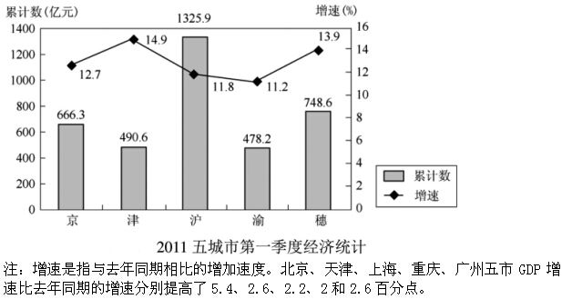 2011年第一季度GDP总量和增速均居同一位的城市有()个。