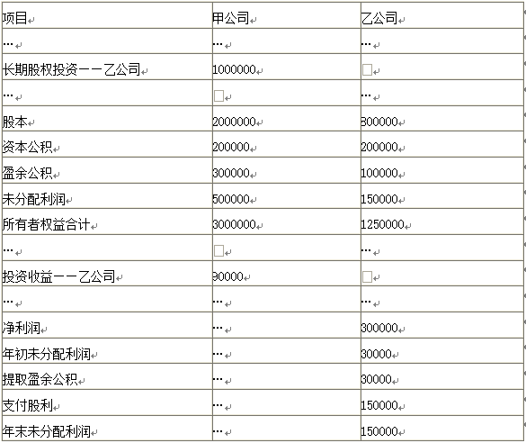 甲公司是乙公司的母公司,持有乙公司60%的股份,其初始投资成本为1000000元。2010年乙公司实现净利润300000元,按净利润的10%提取法定盈余公积30000元,按净利润的50%向投资者分派现金股利150000元。甲公司的长期股权投资采用成本法进行日常核算。假设控制权取得日乙公司净资产的公允价值等于其账面价值,2010年度没有发生其它所有者权益变动情况。2010年年末,甲公司.乙公司有关资料如下: