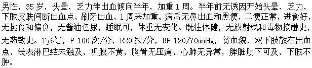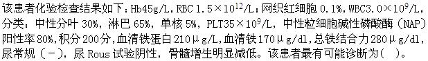 [单选题]A.慢性再生障碍性贫血B.急性粒细胞白血病C.缺铁性贫血D.阵发性睡眠性血红蛋白尿(PNH)E.过敏性紫癜F.以上均不正确