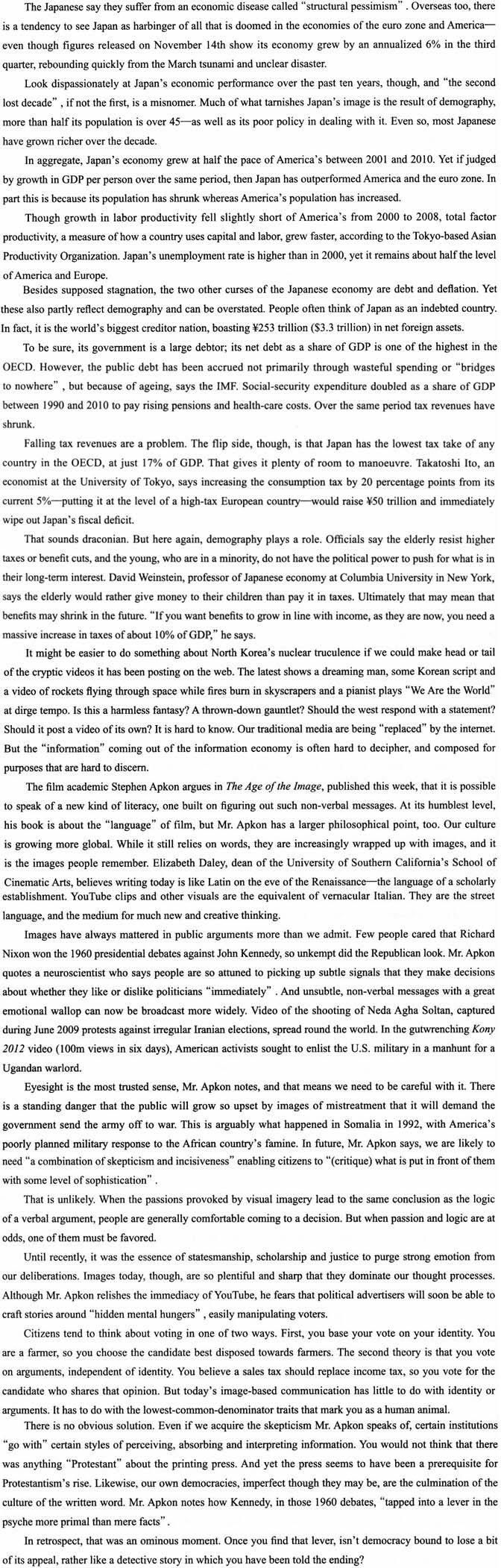 [单选题]阅读文章,回答问题。What measures should be taken to eliminate Japan’s fiscal deficit