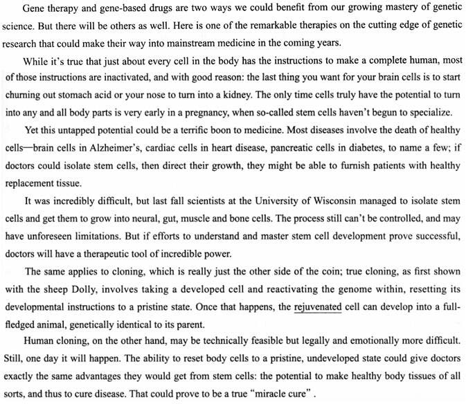 The writer holds that the potential to make healthy body tissues will( )A.aggravate moral issues of human cloning