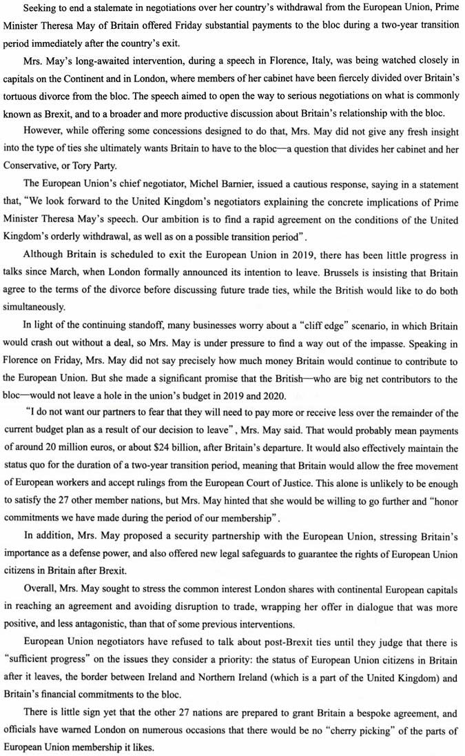 [单选题]阅读文章,回答问题。What’s the purpose of May’s speech?( )A.To demonstrate her resolv